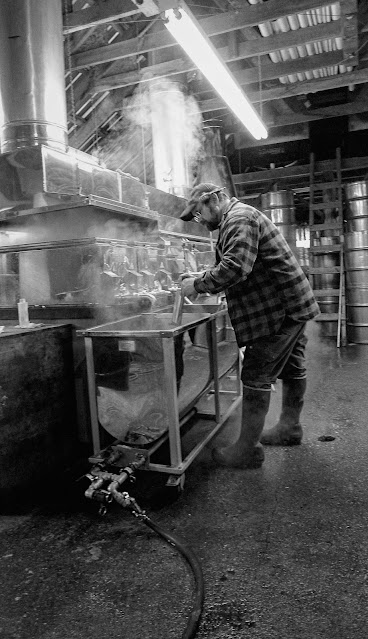 I became friendly with Adam, the farmer who owns a little piece of Heaven called Windswept Farm, several years ago. Adam gives me permission to photograph his property and you may remember seeing other photos taken here in previous blog posts. Adam's property overlooks May Pond in Barton, which is one of my favorite places on Earth. In the above photo, you can see the steam coming from the cupola......a sure sign that the boil is underway.